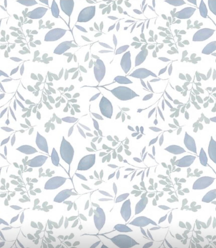 A luxurious linen featuring a dainty and elegant blue leaf print.