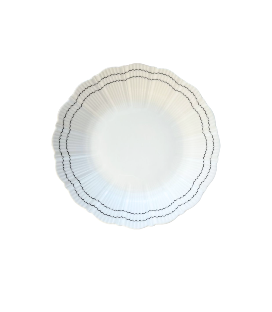 A floral shaped textured bread plate featuring a black, double scallop line pattern.