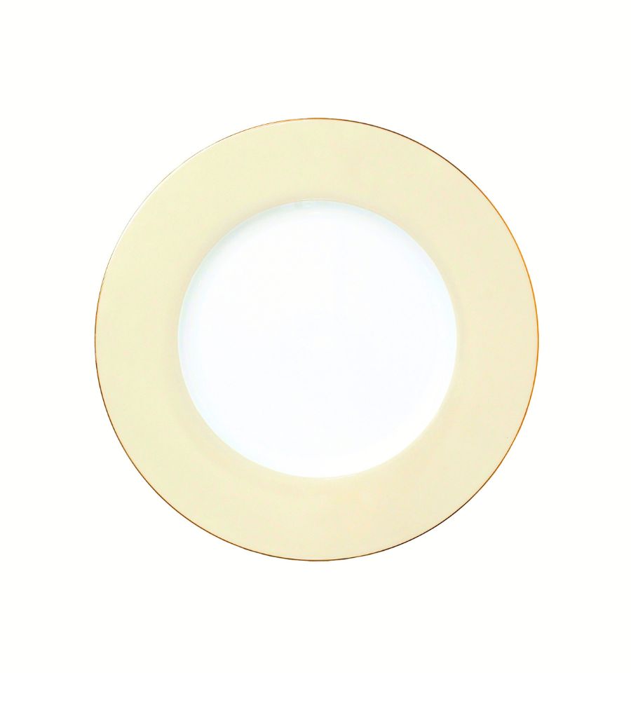 dinner plate with light yellow rim and thin gold trim