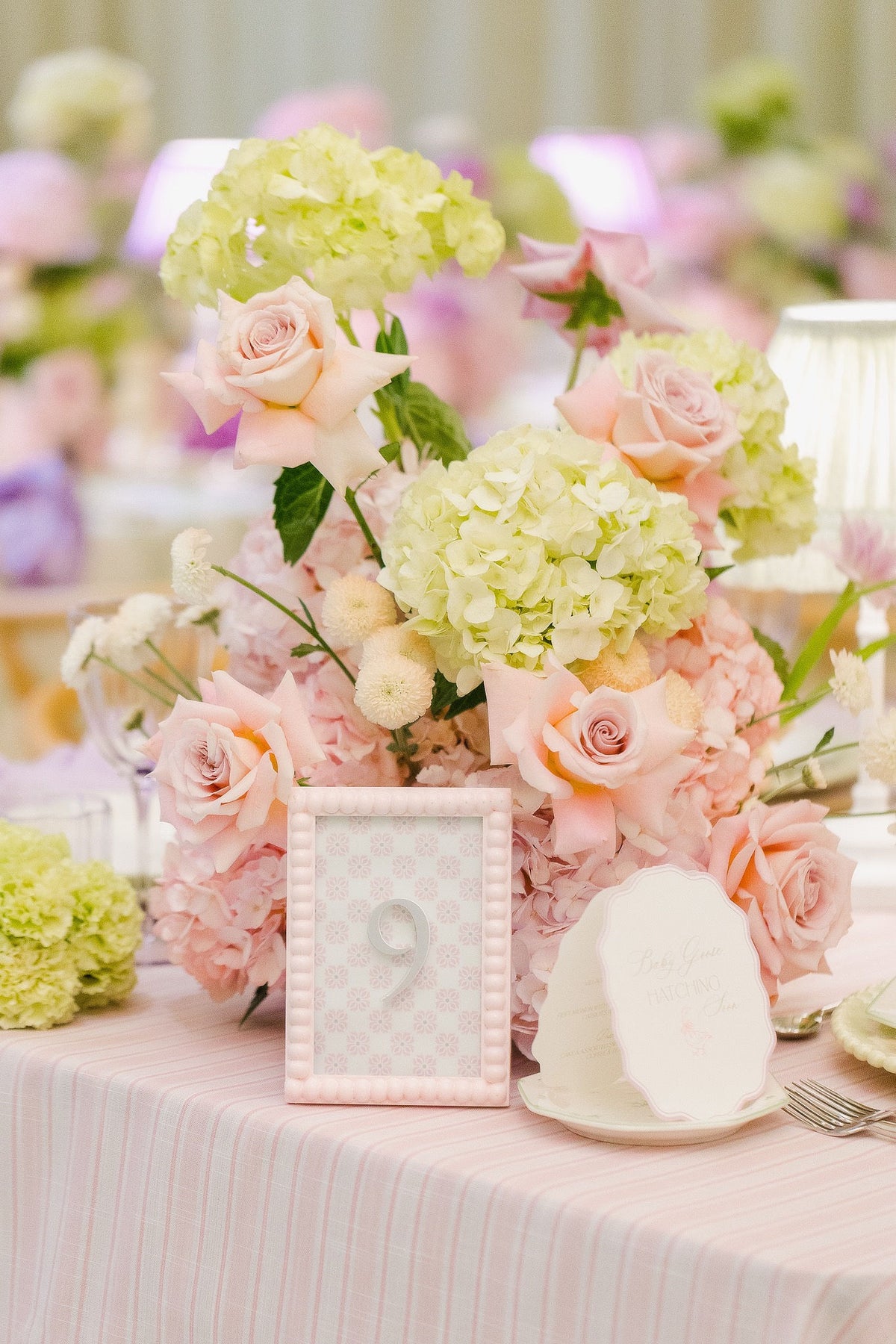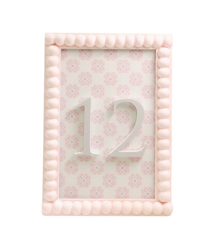 pink framed table numbers with beaded border, pattern backing, and 3d number