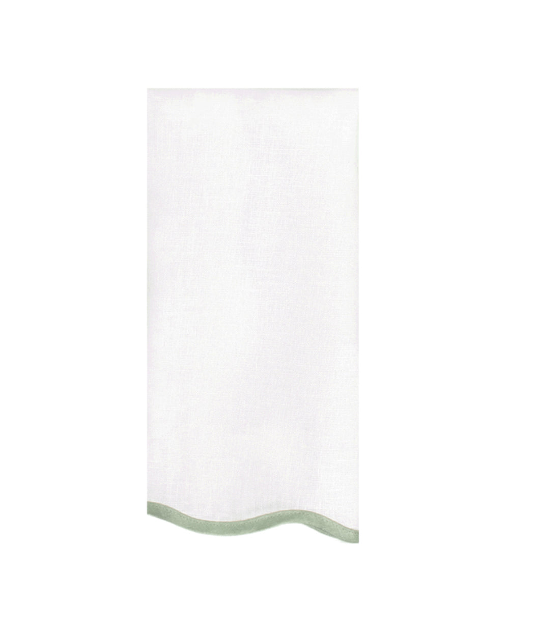 Linen scalloped napkin with an embroidered trim. It’s unique shape and coloured edge sets the table for an elevated dining experience.